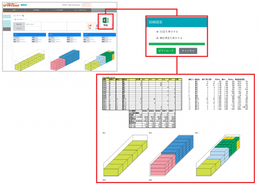 自動計算結果の積載明細(梱包明細)をExcelファイル形式で出力できます。