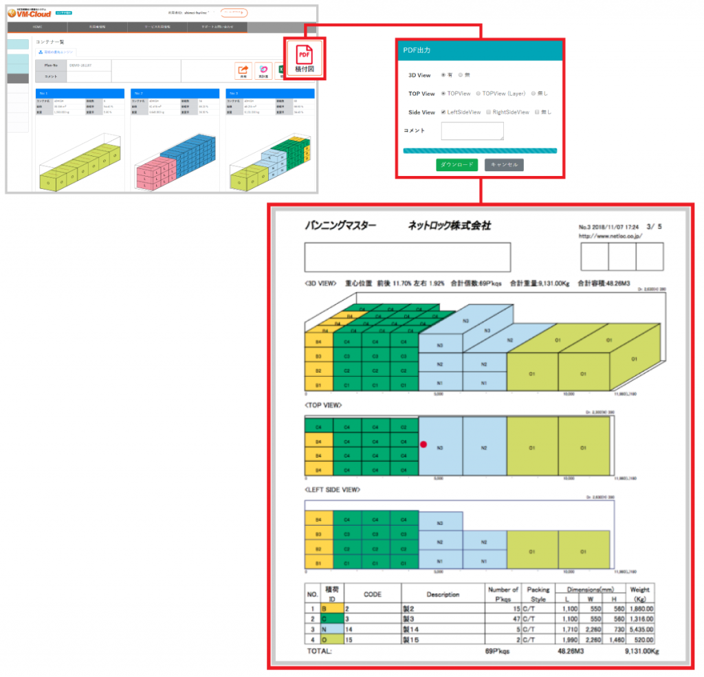 自動計算結果の積載イメージ図をPDFファイル形式で出力できます。