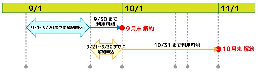 毎月21日〜月末までに解約をお申込みいただいた場合、翌月末での解約となります。